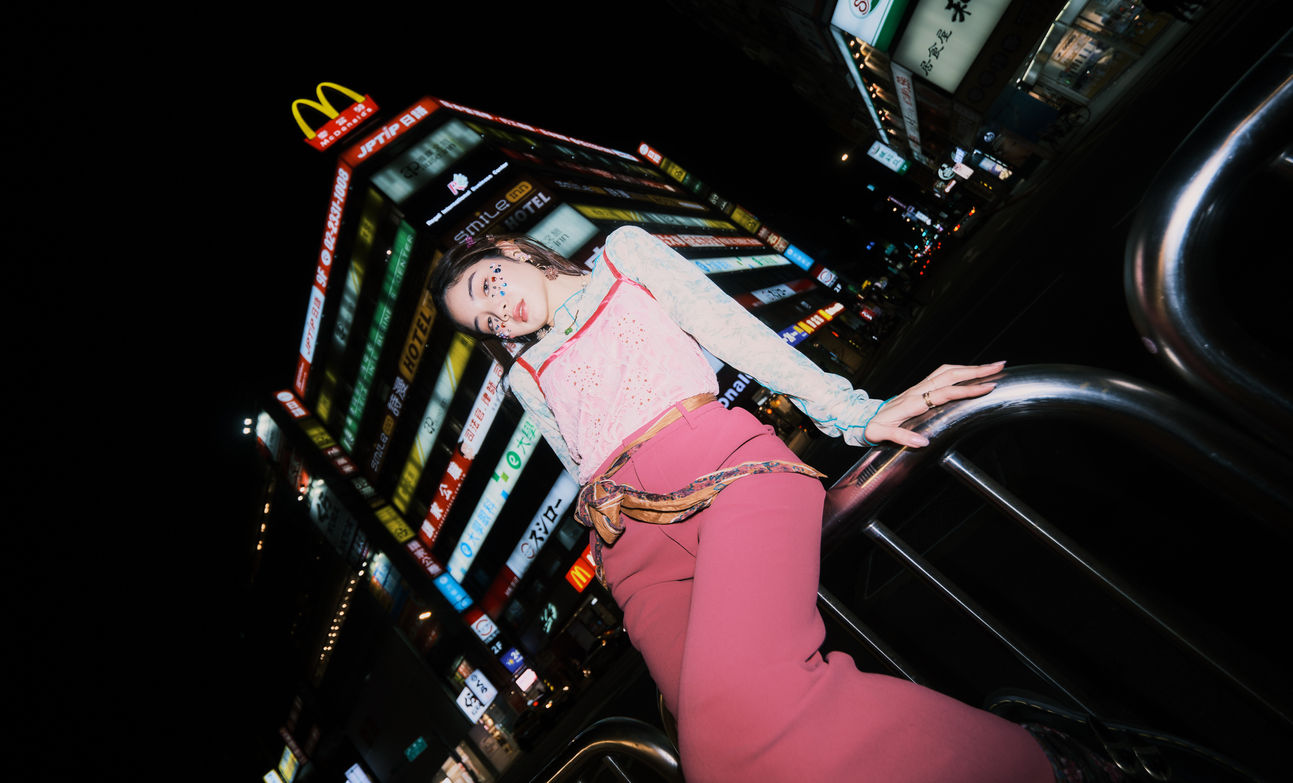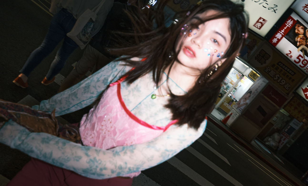 黑色長髮隨冷風微微飄動,臉上的水晶寶石映著微弱的霓虹燈光,彷彿整個人是從舊時代的夢境裡走出來的。